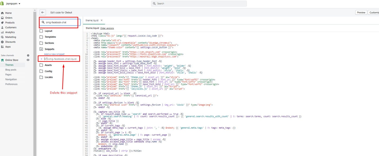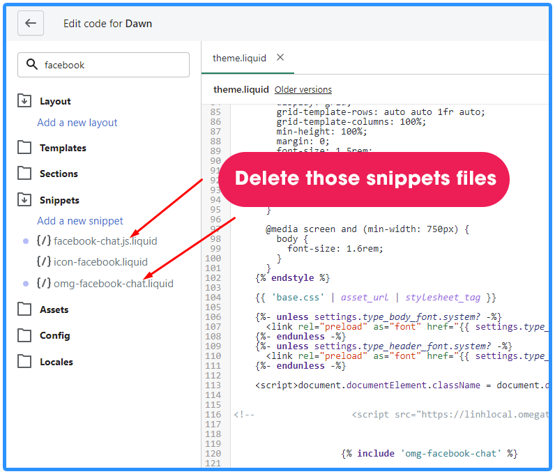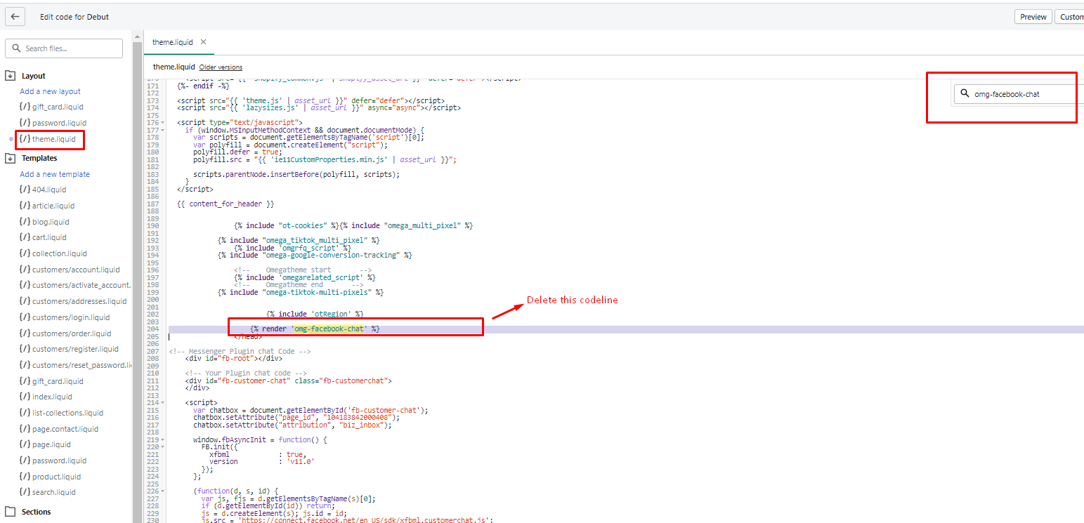 Step 7: Go to Snippets file, then findfacebook-chat.js.liquid and omg-facebook-chat.liquid